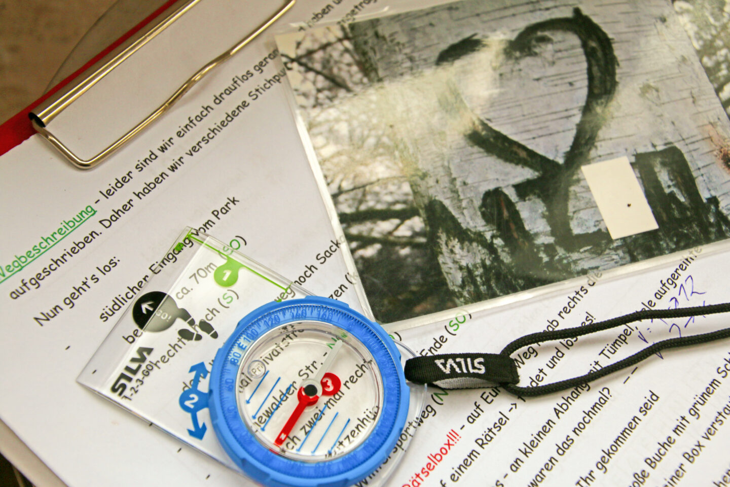 Die Route verläuft außerhalb des Waldseilparks. Auf dem Weg wird der Lösungsbogen vervollständigt, um die Koordinaten für den Schatz zu ermitteln.