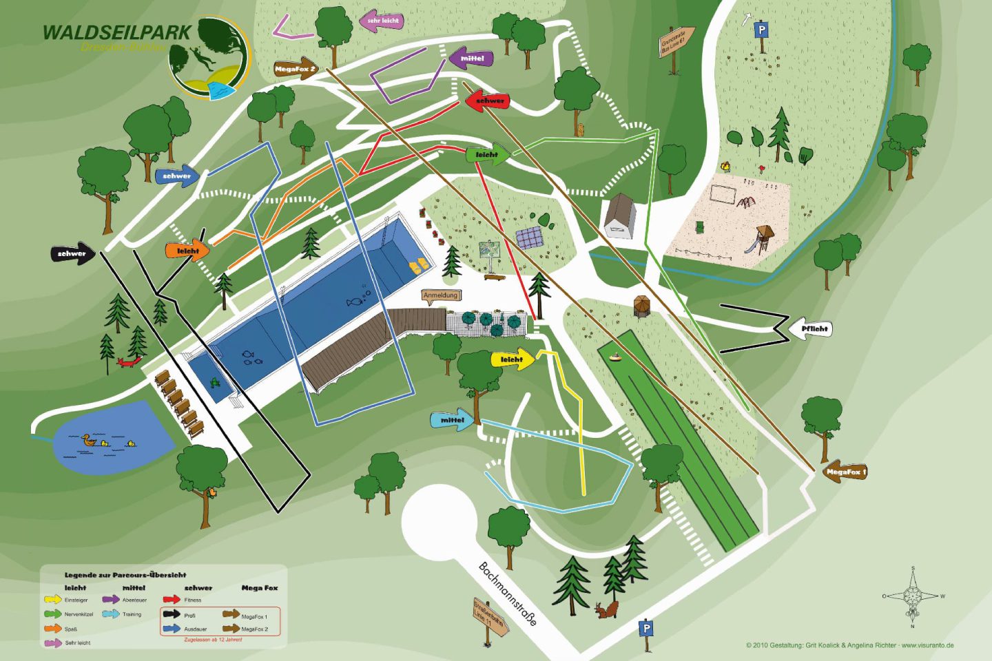 Hier kannst Du nach Herzenslust in Bodennähe und in luftiger Höhe durch Taue und Balken hangeln, über Brücken und Hindernisse klettern, balancieren, schwingen oder springen.